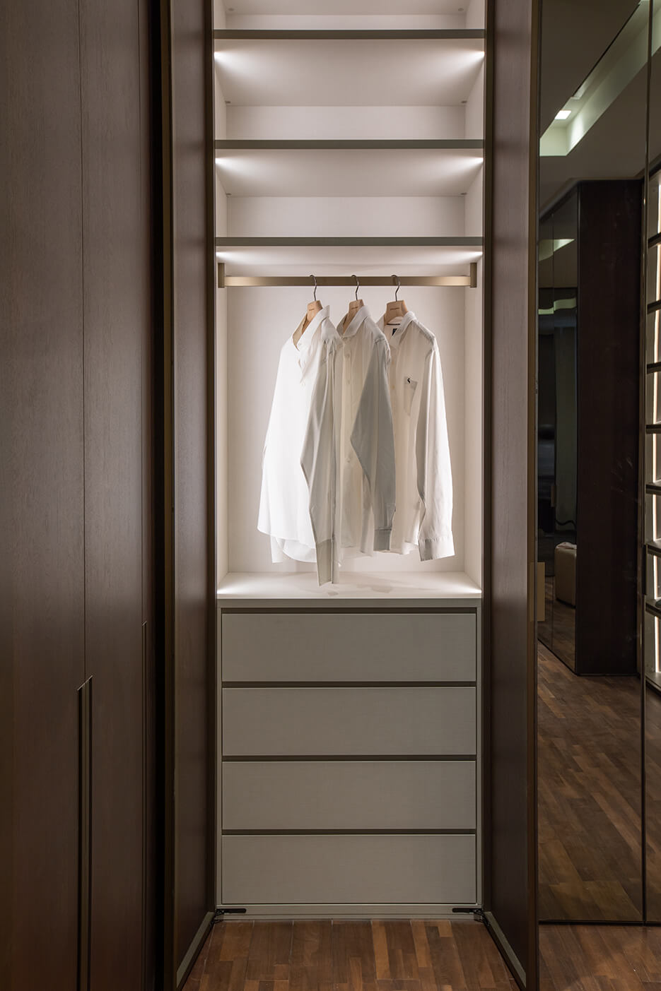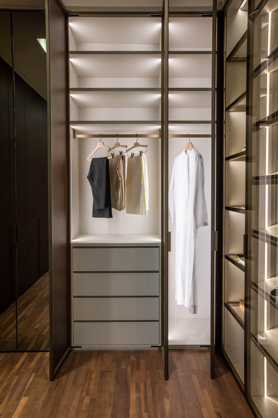 Attention to detail is evident throughout, from soft-lined accessory inserts to seamlessly integrated LED lighting that illuminates each compartment with a subtle, ambient glow. A dedicated dressing area with a wall-mounted mirror and standalone dresser creates a considered, private setting for daily routines.
