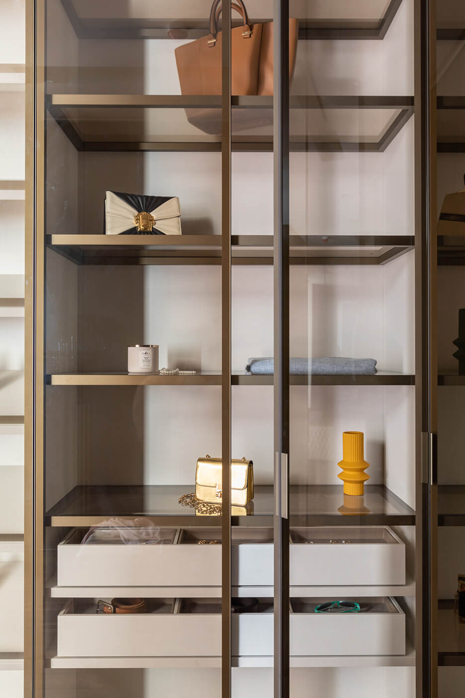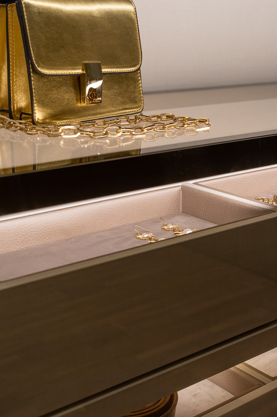Mirrored wardrobe fronts that enhance spatial perception and light. Dedicated compartments for jewellery, belts and accessories, tailored for precise organisation. Glass-fronted cabinetry that introduces transparency and visual rhythm. Integrated LED lighting that elevates both functionality and ambience. A bespoke dressing area designed for comfort, clarity and everyday ease.